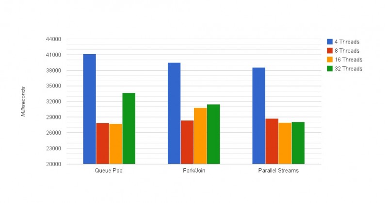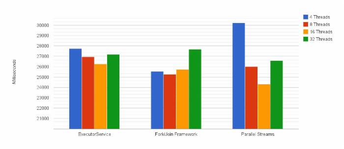 这点非常有意思。在本次测试中,我们发现,并行流的16个线程的再次胜出。不止如此,在这次测试中,不管线程数是多少,并行流的表现都是好的。