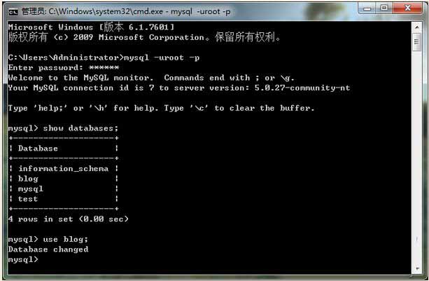 1、“mysql -uroot -p” :输入命令打开数据库,并输入密码建立连接
