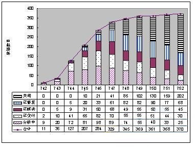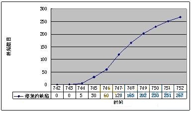 缺陷修复进度(累计缺陷)的X轴为时间,以yww形式表示,其中y表示年份的后两位,ww表示星期,例如:815指的是2008年的第15周。Y轴表示在测试阶段发现的缺陷数目,如图2所示。