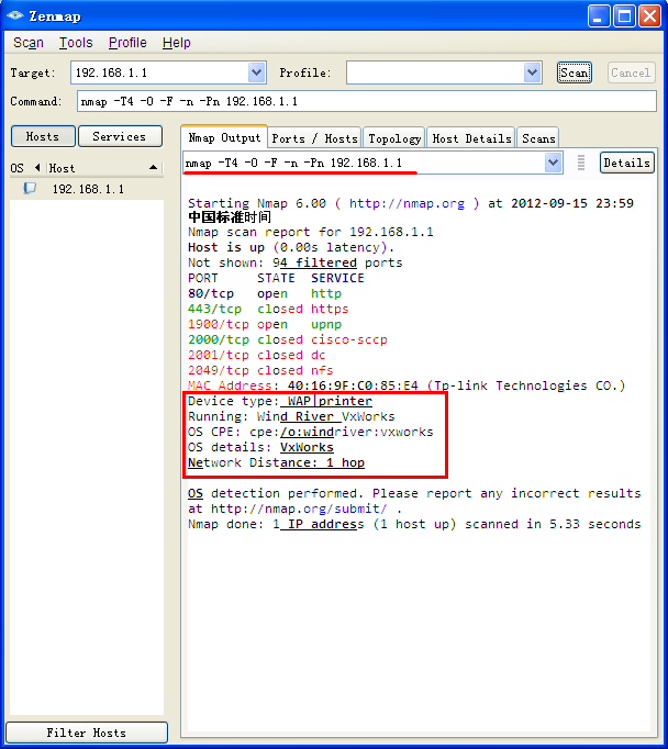 Nmap内部维护了一份系统与设备的数据库(nmap-os-db),能够识别数千种不同系统与设备。所以,可以用来扫描主流的路由器设备。