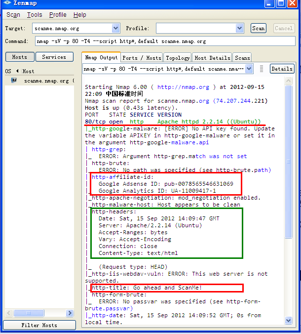 上面以扫描scanme.nmap.org的Web应用展示Nmap提供Web扫描能力,从图中可以看到扫描结果中提供了比较丰富的信息。