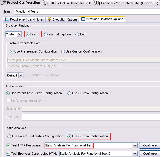 在上面记录的测试集合中,打开项目的配置项,选择浏览器回放选项。一个是浏览器的选择,选择使用什么浏览器回放刚才的功能。 一个是配置使用什么规则扫描,如图 4 所示。