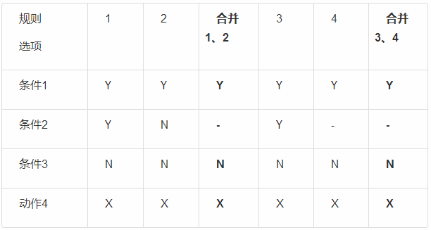 简化判定表(合并相似规则(相同动作)),如下表所示,左侧的两列均可以合并为右侧一列
