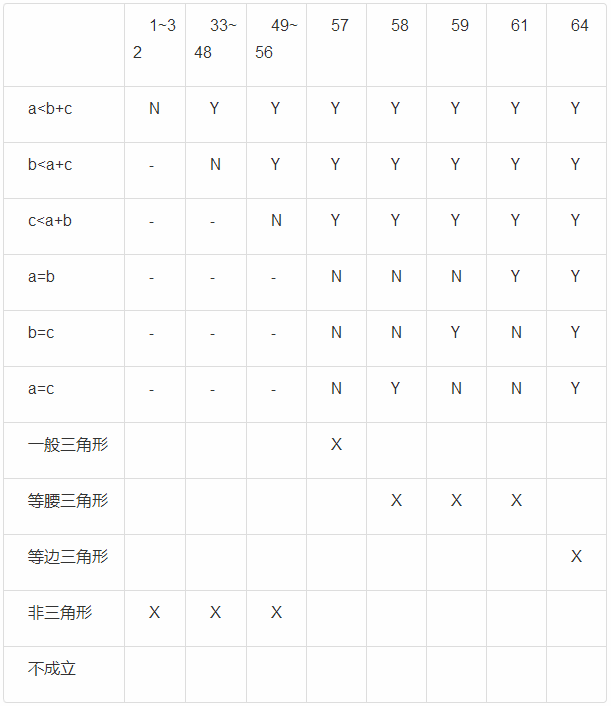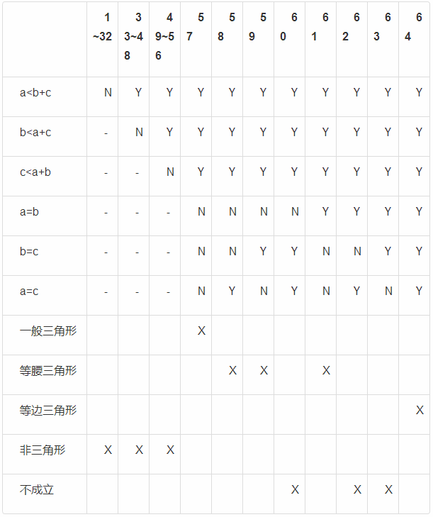 a<b+c、b<a+c、c<a+b、a=b、b=c、c=a,故规则的个数有2的6次方64个