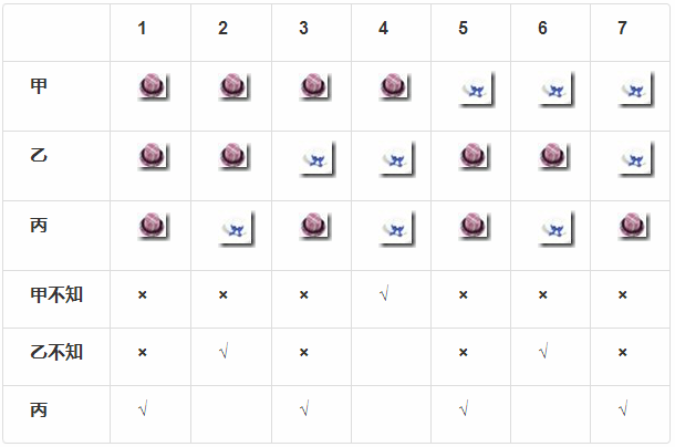 由上述判定表可知,所有符合题干假设的,只有1、3、5、7满足条件,而满足条件的所有组合中,丙均为红色莫阿紫,故而得出结论