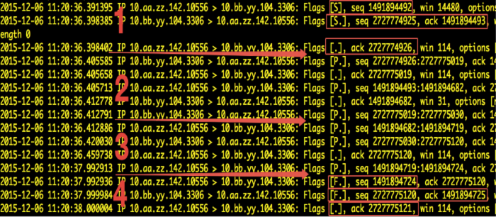 下面我们通过tcpdump抓网络包来验证我们的原理。由于测试在生产环境中进行,为了避免生产网段的IP泄露,对IP作了替换,但不影响分析过程。具体而言, 10.aa.zz.142.10556代表客户端,10.bb.yy.104.3306代表服务器端,3306是服务器的监听端口号。