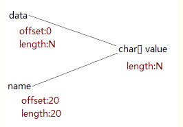 在这里aLongString只是临时的,真正有用的是aPart,其长度只有20个字符,但是它的内部数组却是从aLongString那里共享的,因此虽然aLongString本身可以被回收,但它的内部数组却不能(如下图)。这导致了内存泄漏。如果一个程序中这种情况经常发生有可能会导致严重的后果,如内存溢出,或性能下降。