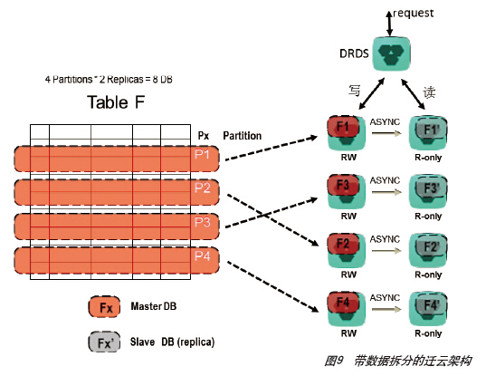 对于数据规模较大的数据库表,可以通过水平切分的方式,将数据分布在多个RDS实例上,通过并行的分布式数据库操作来实现性能和容量的提升。图9是带数据拆分的迁云架构。