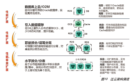 总的来说,通过迁移到RDS、引入数据缓存、分库分表、读写分离等多种方式可以用Scale-Out方式取代原有的IOE架构,并且获得更好的性能和扩展性。图10中是迁云架构演进过程。