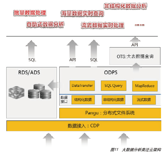 对于OLAP应用,可采用ODPS+OTS+RDS/ADS的解决方案取代小型机+Oracle DB+OLAP+RAC+EMC存储解决方案,如图11所示。总体来看,迁云的通用架构方案如图12所示,针对具体业务系统的迁云方案还需要根据实际情况进行分析和合理选择。