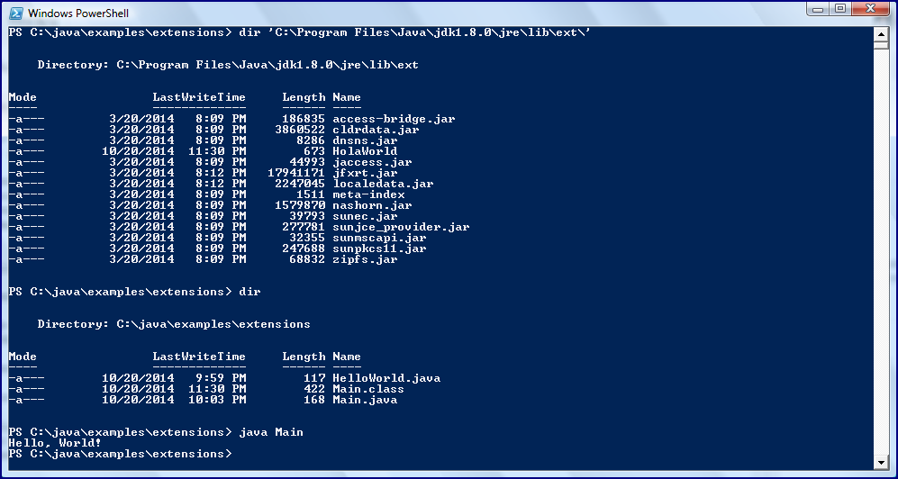后一张截图展示了,扩展目录下过时的HelloWorld类优先于同一目录下的新定义的HelloWorld类加载。甚至当我把当前目录写进 classpath中,扩展目录下的旧版本的类仍然优先。接下来的图也同样展示了扩展目录下的JAR文件“隐藏”了更新的JAR以及其中类的新方法。这些扩展目录下的JAR文件甚至都不是以.jar结尾的。