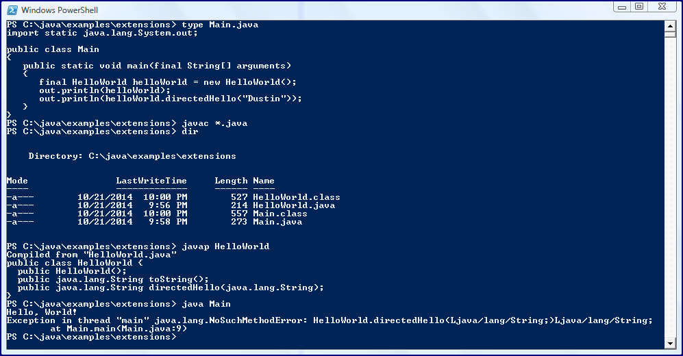 接下来的两段代码展示了Main.java和HelloWorld.java修改后的版本。特别要注意的是,HelloWorld有一个全新的方法,这个 方法会被新版本的Main调用。在这个例子中,我会把新编译的HelloWorld.class文件和Main放在同一个目录下。这样当我运行Main 的时候,能证明扩展目录下的JAR中过时的类会比当前目录下的新类优先加载。