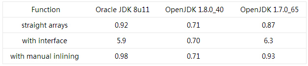 Erich Schubert使用 double 数组运行简单的benchmark类发现他的运行结果与我的结果相矛盾,而且我们的变量实现都是一样的。我通过更新到新版本的OpenJDK证明了他的结果。下面的表格给出了处理10百万整数需要的纳秒时间: