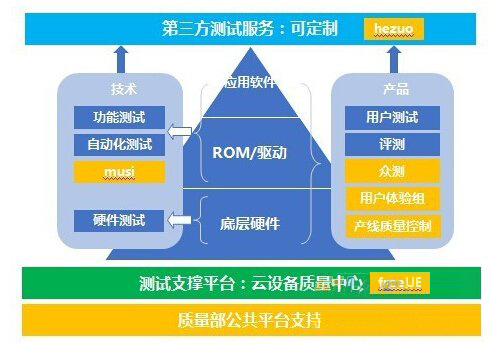 云设备质量保证体系如图4,分为技术和产品两大主线:技术能力主要集中在硬件实验室:包括硬件测试平台、软件测试平台和第三方服务测试平台,提供专业的自动化测试和问题定位分析能力,详见本文第4章硬件实验室;产品能力主要集中在用户实验室:包括用户测试、评测,用户行为分析等,提供全面的用户体验改进和需求分析能力,详见本文第5章用户实验室。质量部公共平台和云设备质量中心作为支撑平台,为云设备质量保证提供基础服务能力,云设备质量中心详见本章3.2节云设备质量中心。