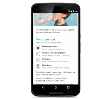 这些内容来自于谷歌的“知识图谱”(Knowledge Graph),这其中包括常见健康问题的症状、治疗和其他信息。