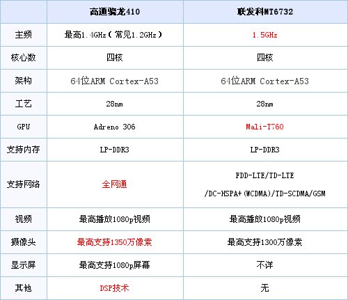 事实上,真正影响到用户使用的,用户真正需要关心的参数那么几项,其他参数不能说不重要,但对于用户来说没必要是考虑的。笔者写这篇文章的目的是简化这些参数,从中抓取中有用的信息加以对比。下面让我们按价位的不同,分别对比一下这两家处理器的优缺点。首先是千元内入门级的高通骁龙410系列和联发科MT6732。(红色为优胜项)