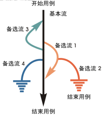 备选流用不同的彩色表示,一个备选流可能从基本流开始,在某个特定条件下执行,然后重新加入基本流中(如备选流 1 和 3);也可能起源于另一个备选流(如备选流 2),或者终止用例而不再重新加入到某个流(如备选流 2 和 4)