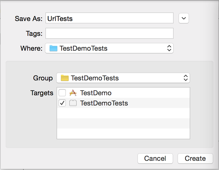然后在TestDemoTests文件夹下创建UrlTests文件,此时由于该类只需要在测试中才能用到,所以只需要在Targets选择TestDemoTests可以了: