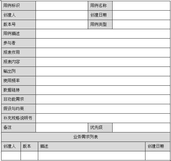 这是我设计的查询报表类用例的格式,同时还可以在后面配上报表的格式。你也可以根据需要设计你自己的格式,用例不是什么阳春白雪的高级玩意儿,而是沟通你、用户、开发设计人员的桥梁。该说明的都说到了,该分析的都分析了,大家都能看明白,并以此为根据去完成各自的工作,这才是用例说明的实质,其它神马都是浮云。