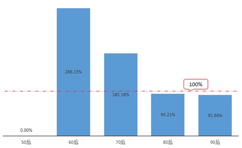 本次泄露事件中有81名用户使用了手机做密码。其中,60后的占比(占比即不同年龄段使用手机的占比与不同年龄段用户总数占比的比值)高,并且随着年龄的降低,这一使用习惯占比逐渐降低。