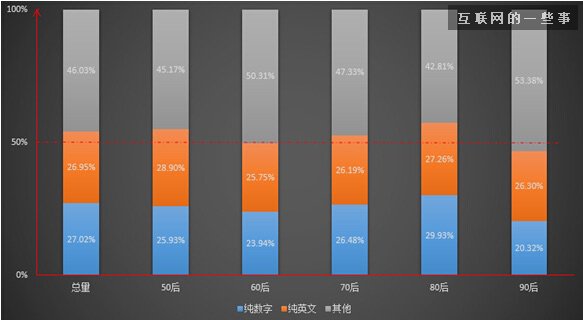 我们发现,该网站有一半以上的用户还在使用纯数字或纯英文这种单一的密码设置形式,使用组合密码的用户只占了46%。在如此高敏感高风险的网站中,居然有这么多用户的密码设置这么简单。在这之中,尤其以80后使用组合密码的为少,只占了42%。而90后使用组合密码的超过了一半,为53.38%。看来90后在密码安全意识上是要略强过80后的。