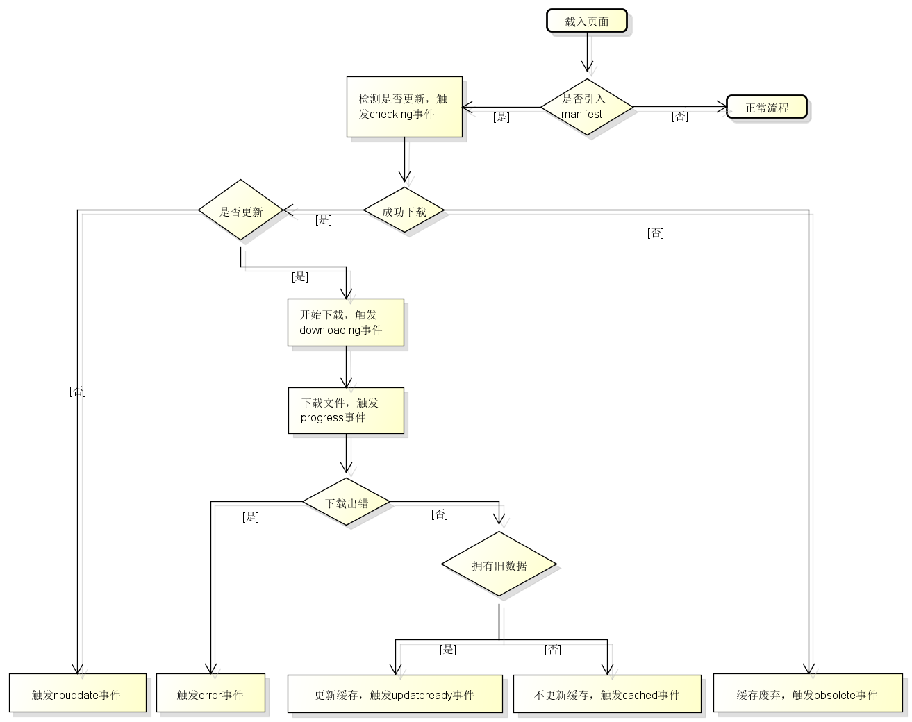 由更新机制来说,首次更新manifest时,因为页面加载已经开始甚至已经完成,缓存更新尚未完成,浏览器仍然会使用过期的资源;浏览器是当Application Cache有更新时,该次不会使用新资源,第二次才会使用。这个时候update事件中执行window.reload事件。