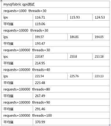 从以上数据说明,mysqlfabric的ips和qbs的性能是随着进程数的增加而呈正比例上升的,上升的幅度不大,以上测试采用的是默认的mysql配置,可以调整innodb_buffuer_size这个参数来增加mysql的性能,得出来的不尽如人意。