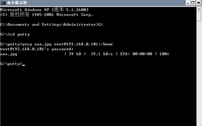 如将aaa.jpg传到/home下,则:pscp aaa.jpg root@192.168.0.101:/home