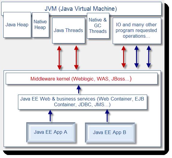 图中展示的JVM、中间件和应用程序件之间的一些简单和典型的交互。如你所见,标准Java EE应用程序的线程的分配实在中间件内核与JVM之间完成的。(当然也有例外,应用程序可以直接调用API来创建线程,这种做法并不常见,而且在使用的过程中也要特别的小心)