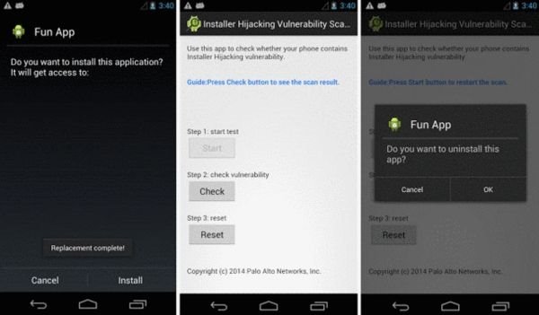 据了解,上述漏洞可以将合法应用替换为恶意软件,从而窃取手机用户敏感信息。安全人员举例称,一款名为“Android应用安装器劫持”的恶意应用可利用该漏洞,这款应用拥有全部权限,包括访问用户数据和密码。