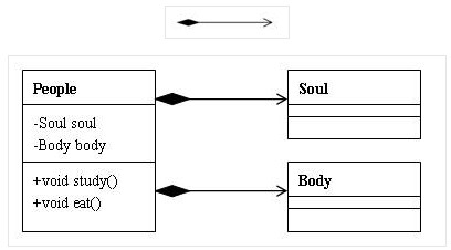 相比于聚合,组合是一种耦合度更强的关联关系。存在组合关系的类表示“整体-部分”的关联关系,“整体”负责“部分”的生命周期,他们之间是共生共死的;并且“部分”单独存在时没有任何意义。在下图的例子中,People与Soul、Body之间是组合关系,当人的生命周期开始时,必须同时有灵魂和肉体;当人的生命周期结束时,灵魂肉体随之消亡;无论是灵魂还是肉体,都不能单独存在,他们必须作为人的组成部分存在。