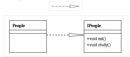 表示一个类实现一个或多个接口的方法。接口定义好操作的集合,由实现类去完成接口的具体操作。在java中使用implements表示。UML图例中,实现关系用虚线+空心箭头表示,箭头指向接口。