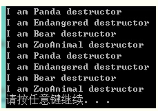 假定上面四个指针都指向Panda对象,则每种情况发生完全相同的析构函数调用次序,即与构造次序是逆序的:通过虚机制调用Panda析构函数,再依次调用Endangered、Bear,ZooAnimal的析构函数。