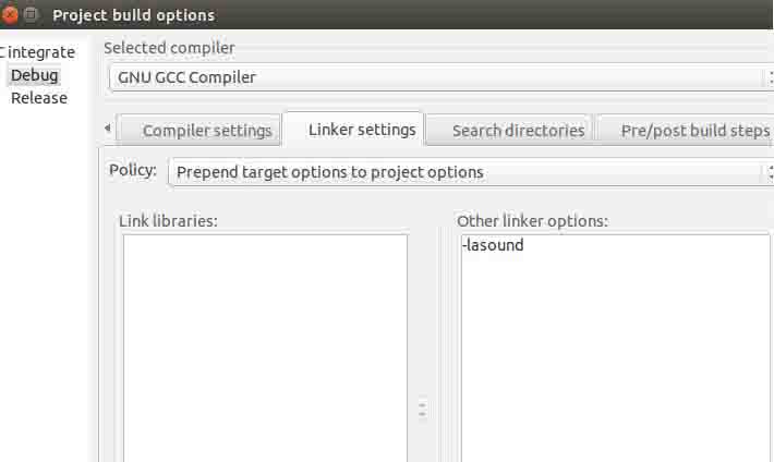 在编译的时候,记得链接alsa-lib库。具体方法是在codeblocks的编译对话框中,找到linker settings选项,在Other linker options中输入:-lasound。