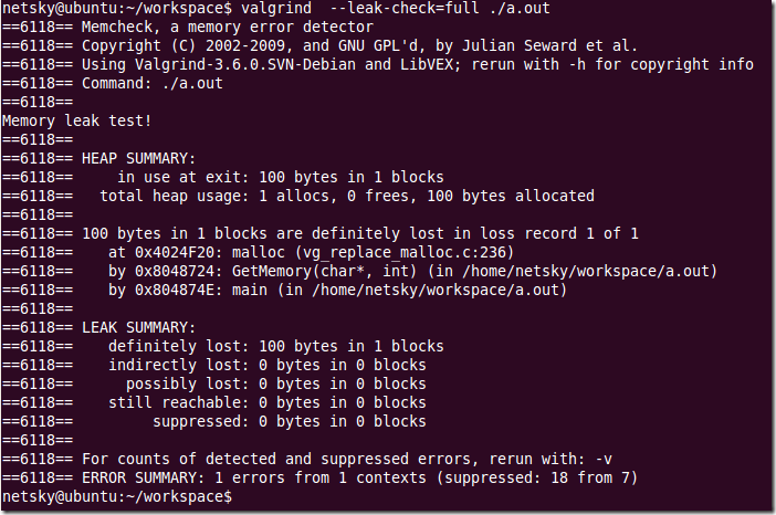 ==6118== by 0x8048724: GetMemory(char*, int) (in /home/netsky/workspace/a.out)