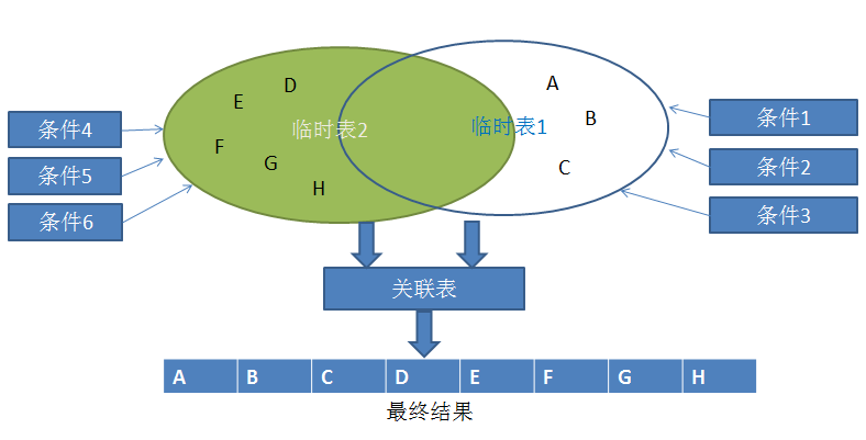 *1)定义全局的临时表,先根据六个查询条件的任意一个,得出临时表结果