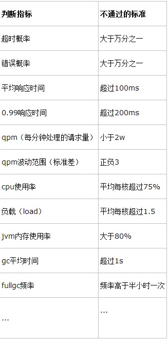 不同服务测试指标应该不同,相应的标准也不同,例如接入层服务和后端服务指标是不同的。如果我们能为各个服务制定类似如下的标准,以后再进行性能测试有了参考依据。 随着服务的发展,这些标准也会随之相应改动,要求会越来越严格。