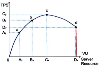 图1 淘宝性能测试曲线(a点:性能期望值;b点:高于期望,系统资源处于临界点;c点:高于期望,拐点;d点:超过负载,系统崩溃)