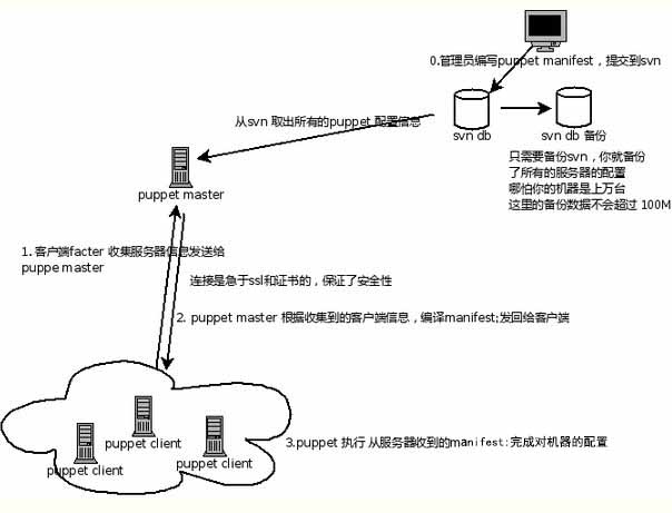 puppet 是一个配置管理工具, 典型的, puppet 是一个 C/S 结构, 当然,这里的 C 可以有很多,因 此,也可以说是一个星型结构. 所有的 puppet 客户端同一个服务器端的 puppet 通讯. 每个 puppet 客户端每半小时(可以设置)连接一次服务器端, 下载新的配置文件,并且严格按照配 置文件来配置服务器. 配置完成以后,puppet 客户端可以反馈给服务器端一个消息. 如果出错, 也会给服务器端反馈一个消息. 下图展示了一个典型的 puppet 配置的数据流动情况.