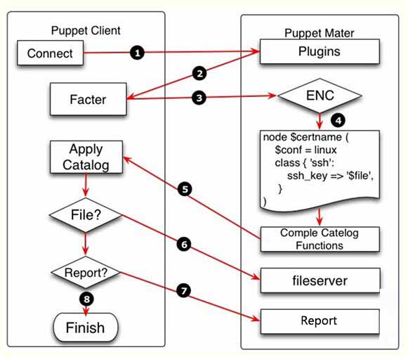 Puppet 采用了非常简单的 C/S 架构,所有数据的交互都通过 SSL 进行,以保证安全。它的工作流程如图所示