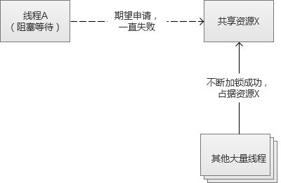 饿死现象(某个线程,一直获取不到它想要锁资源,永远无法执行下一步):
