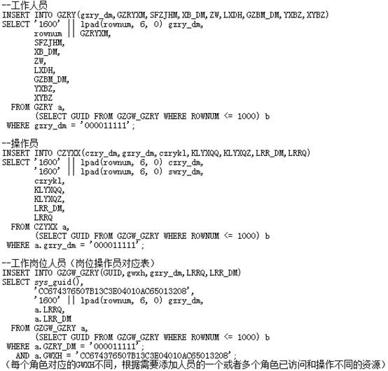 理清楚表关系图中的对应关系后,可以根据并发需要准备相应的后台sql来完成操作,下图为中国软件评测中心在执行性能测试项目的过程中通过后台批量创建登录帐户、生成工作人员、操作员及对应权限的sql示例: