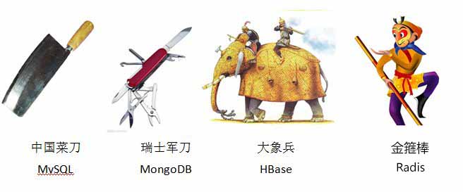 如果将NoSQL比作兵器的话,可以这样(MySQL是典型的关系型数据库,一样参与比较):