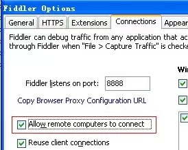 在一台windows机器上安装并打开fiddler,然后在fiddler options中勾选如下截图中红框中的复选框,并设置上面的端口号,默认为8888: