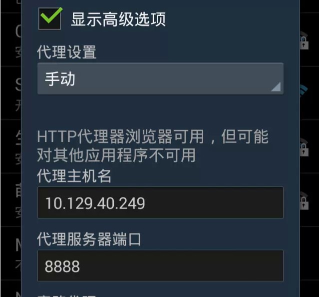 在手机的wifi设置中,修改当前连接的wifi配置,里面会有代理服务器的设置,然后设置好fiddler所在机器的IP和端口8888(注意,fiddler所在机器和手机必须在一个局域网内)。