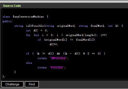 题目描述:现有两个字符串originalWord和finalWord,仅由字母'a'或'b'组成,我们把将originalWord中的某个字符由'a'变作'b'或者由'b'变作'a'称为一次move;另有整型数k,问能否通过恰好k次move将originalWord变为finalWord?如果能够实现,返回字符串"POSSIBLE",否则返回"IMPOSSIBLE"。