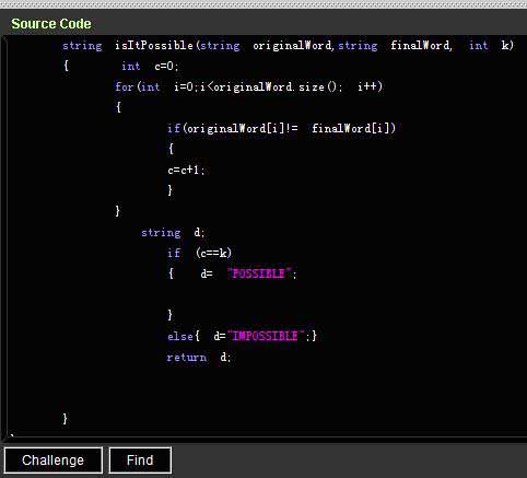 显然这段代码不能完全实现题目中的需求,我们只需设计一个测试用例使得后一个字符左右了程序的输出结果即可。例如,originalWord="aaa",finalWord="aab",k=0,如果没有后一个字符,显然应该返回"POSSIBLE",然而后一个字符的存在使得结果变成了"IMPOSSIBLE",而这一切对于上面的代码而言好像在比较originalWord=finalWord="aa"一样,所以该测试用例成功Challenge了该代码!