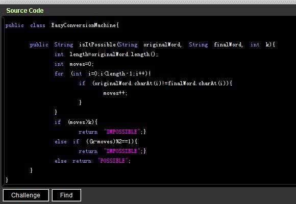 分析:很明显,题目很水,其实只要统计originalWord与finalWord中不同字符的个数diff,然后将diff与k作比较即可。如果diff大于k,那么一定返回"IMPOSSIBLE",因为需要move的步数不够;如果diff等于k,显然应返回"POSSIBLE";如果diff小于k,那么应考察(k-diff)的奇偶性,如果(k-diff)为偶数,应该返回"POSSIBLE",因为此时多余的move可以通过将某个字符连续move(即由'a'变作'b'后再由'b'变回'a')消化掉,但如果(k-diff)为奇数,则要返回"IMPOSSIBLE",因为后会有一次move变不回原来的字符了。