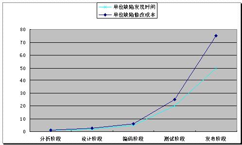 产业界的大量研究(TRW、Nippon Electric和Mitre Corp.以及其它一些公司)表明设计活动引入的错误占软件过程中出现所有错误(和终的缺陷)数量的50%到65%。根据IBM的研究表明,假定在分析阶段发现的错误其改正成本为1个单位的话,那么在测试之前(设计编码阶段)发现一个错误的修改成本约为6.5个货币单位,在测试时(集成测试,系统测试和验收测试)发现一个错误的修改成本约为15个货币单位,而在发布之后(已经交到用户手上)发现一个错误的修改成本约为60到100个货币单位。同样该比例也适用用于发现一个错误需要的时间。我们可以看下面两条曲线图: