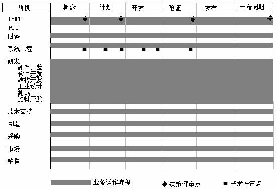 IPD(Integrated Product Development)流程是由IBM提出来的一套集成产品开发流程,非常适合于复杂的大型开发项目,尤其涉及到软硬件结合的项目。IPD从整个产品角度出发,流程综合考虑了从系统工程、研发(硬件、软件、结构工业设计、测试、资料开发等)、制造、财务到市场、采购、技术支援等所有流程。是一个端到端的流程。在IPD流程中总共划分了六个阶段(概念阶段、计划阶段、开发阶段、验证阶段、发布阶段和生命周期阶段),四个个决策评审点(概念阶段决策评审点、计划阶段决策评审点、可获得性决策评审点和生命周期终止决策评审点)以及六个技术评审点,具体可以参考图2。IPD流程是一个阶段性模型,具有瀑布模型的影子。该模型通过使用全面而又复杂的流程来把一个庞大而又复杂的系统进行分解并降低风险。一定程度上,该模型是通过流程成本来提高整个产品的质量并获得市场的占有。由于该流程没有定义如何进行流程回退的机制,因此对于需求经常变动的项目该流程显得不大适合了。并且对于一些小的项目,也不是非常适合使用该流程。